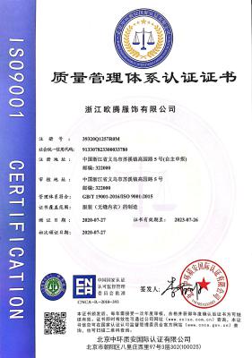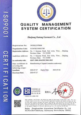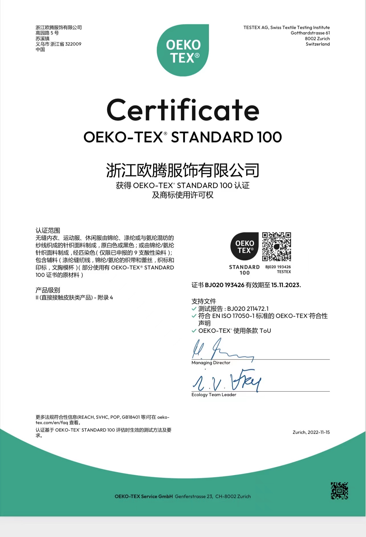 浙江歐騰服飾有限公司位于世界小商品之都-義烏。創(chuàng)立于2015年,是一家專業(yè)生產(chǎn)無縫針織運動服飾和內(nèi)衣的工貿(mào)一體企業(yè),擁有自主出口權。 工廠的占地面積約16000平方米 ,引進了大型圣東尼、高騰等多種先進的制衣設備300余臺。月產(chǎn)能可達90萬件。 歐騰服飾每年投入近百萬資金打樣開發(fā)新產(chǎn)品,有著一支高素質(zhì)設計、技術員工隊伍。工廠先后通過了ISO 9001質(zhì)量管理體系認證、BSCI認證、GRS認證、OEKO-TEX國際生態(tài)紡織品認證等多項專利檢測報告。可提供OEM&ODM服務。歐騰服飾以一套完整、科學的質(zhì)量管理體系,生產(chǎn)的服裝從原材料紗線到成衣,質(zhì)量完全能夠滿足國內(nèi)、國際質(zhì)量要求。獲得了客戶一致好評。工廠先后獲得省科技型企業(yè)、國家高新企業(yè)、義烏市誠信講信用單位、規(guī)上企業(yè)、信用AAA級等榮譽。